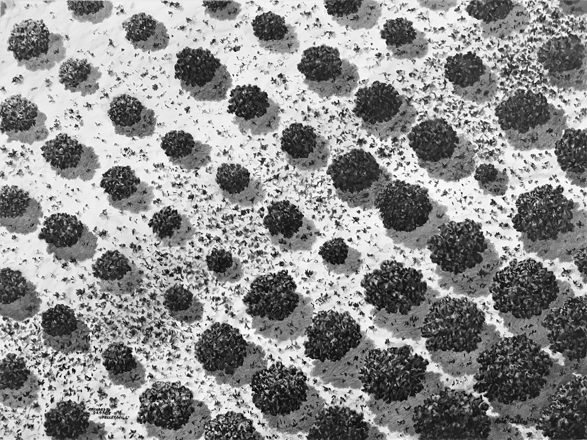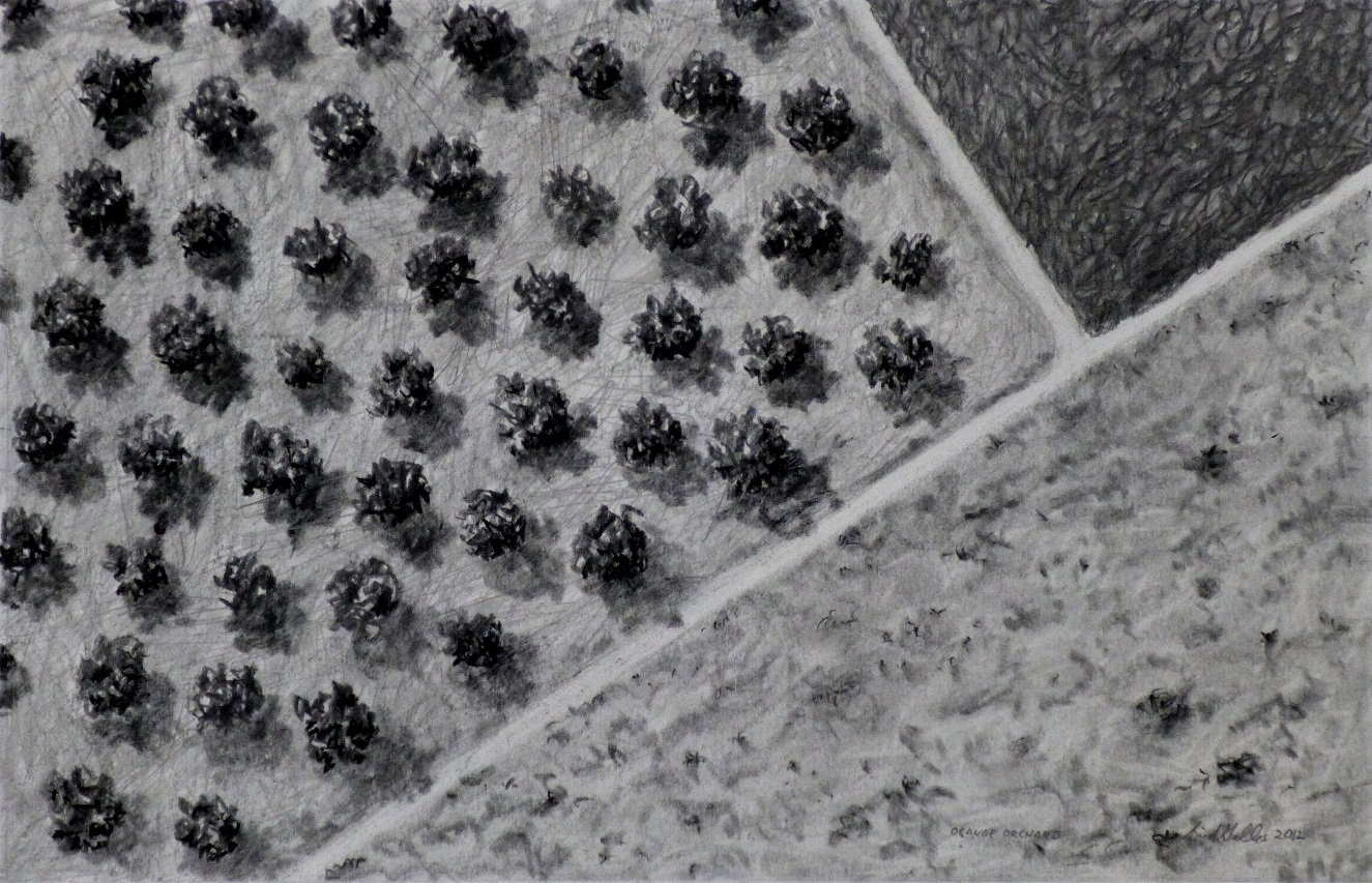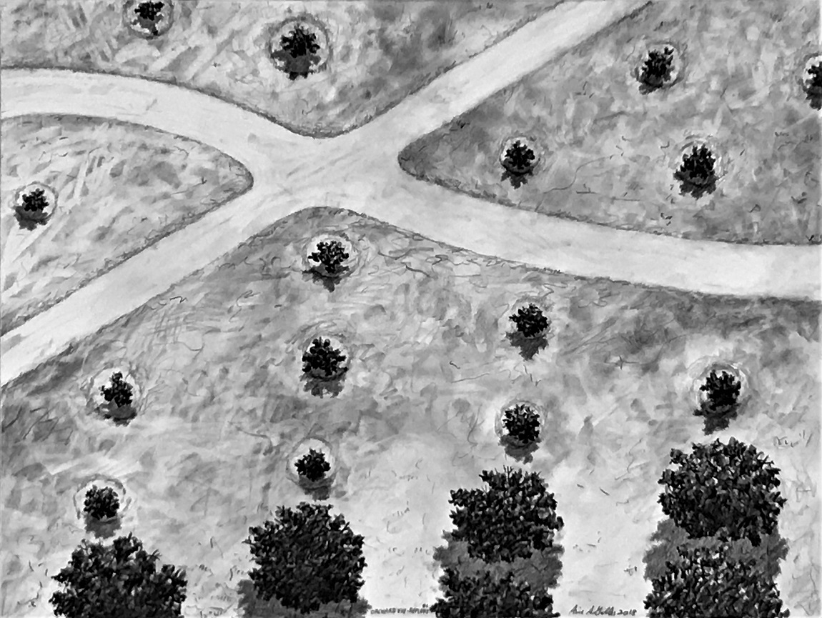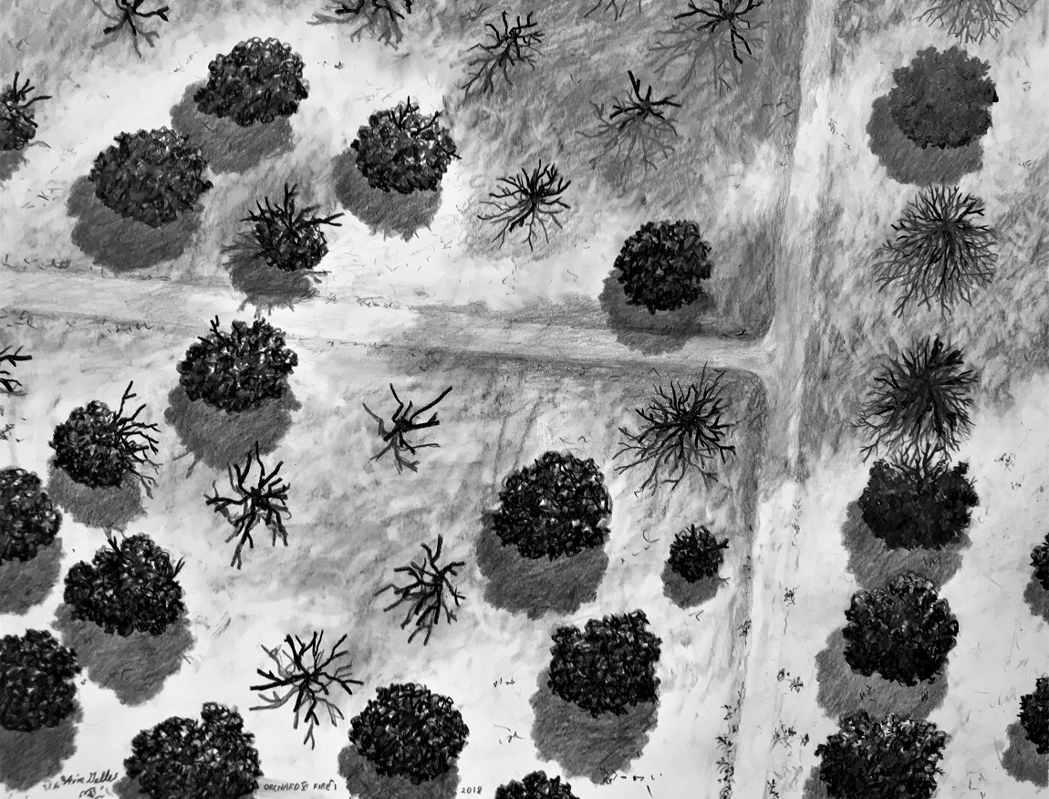 I began this series in 2012. Other commitments intervened, and I returned to this theme in 2017. On flights through California I became fascinated with the striking patterns of light and shadow created by the ubiquitous orchards below. These drawings are a contemplation on the permanence and evanescence of such sights. Healthy, watered and tended orchards in contrast with abandoned and bulldozed orchards giving way to ‘progress,” i.e. malls, industrial parks and housing developments.