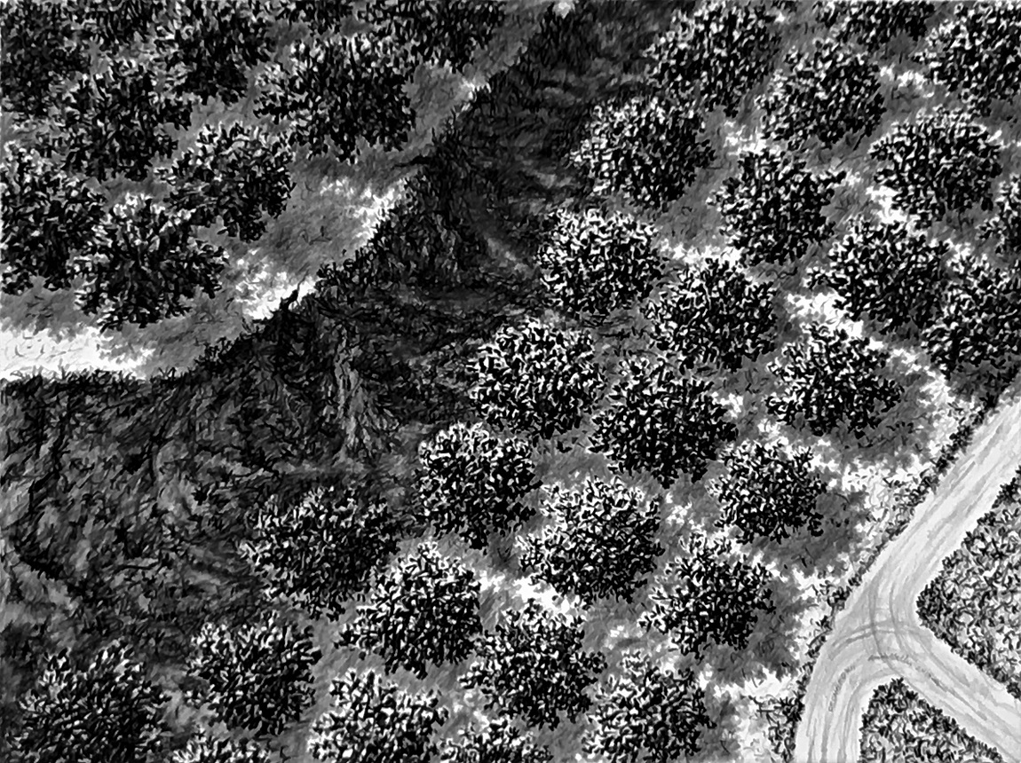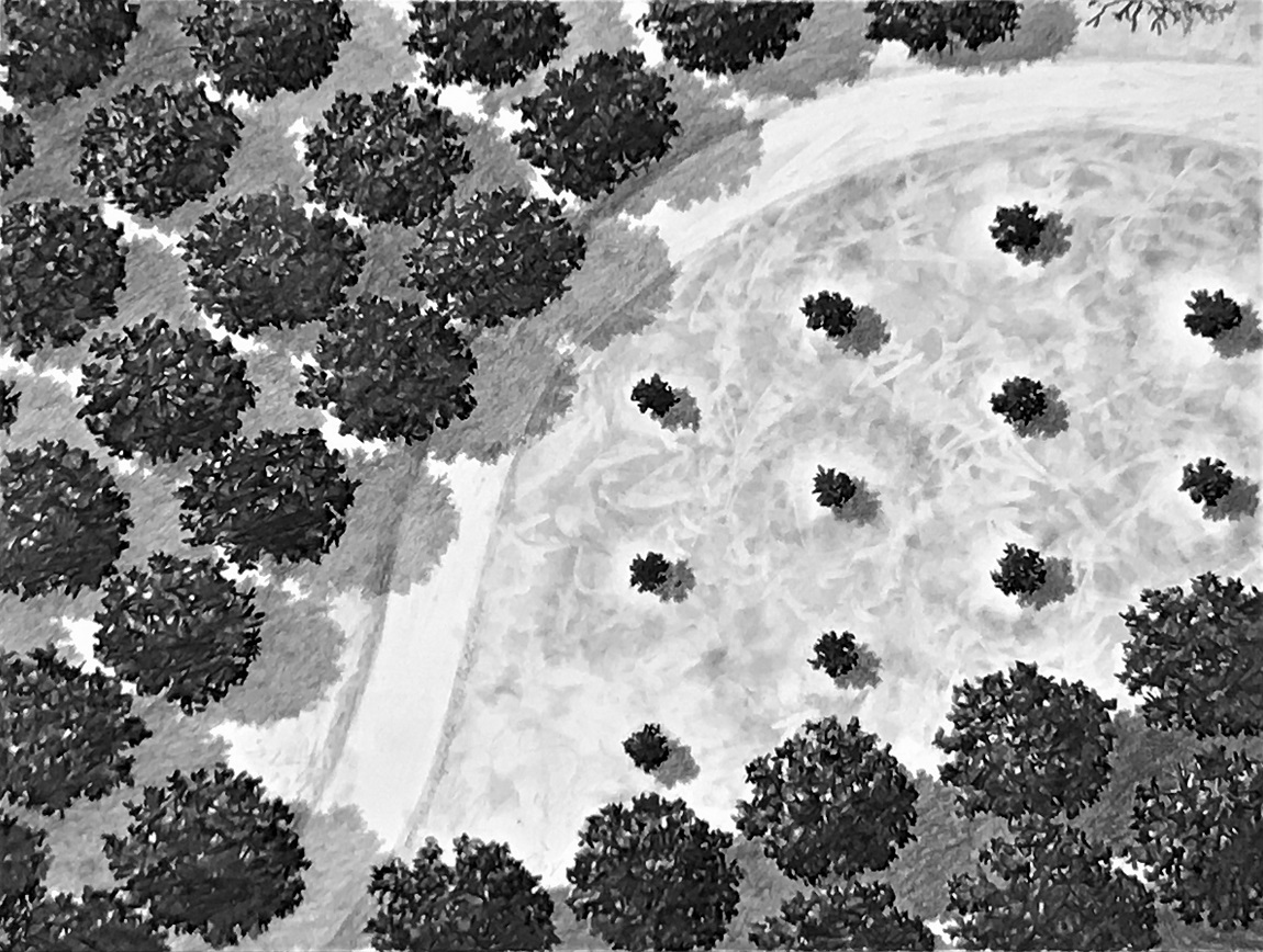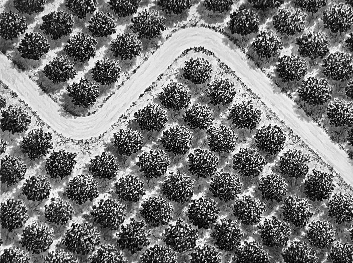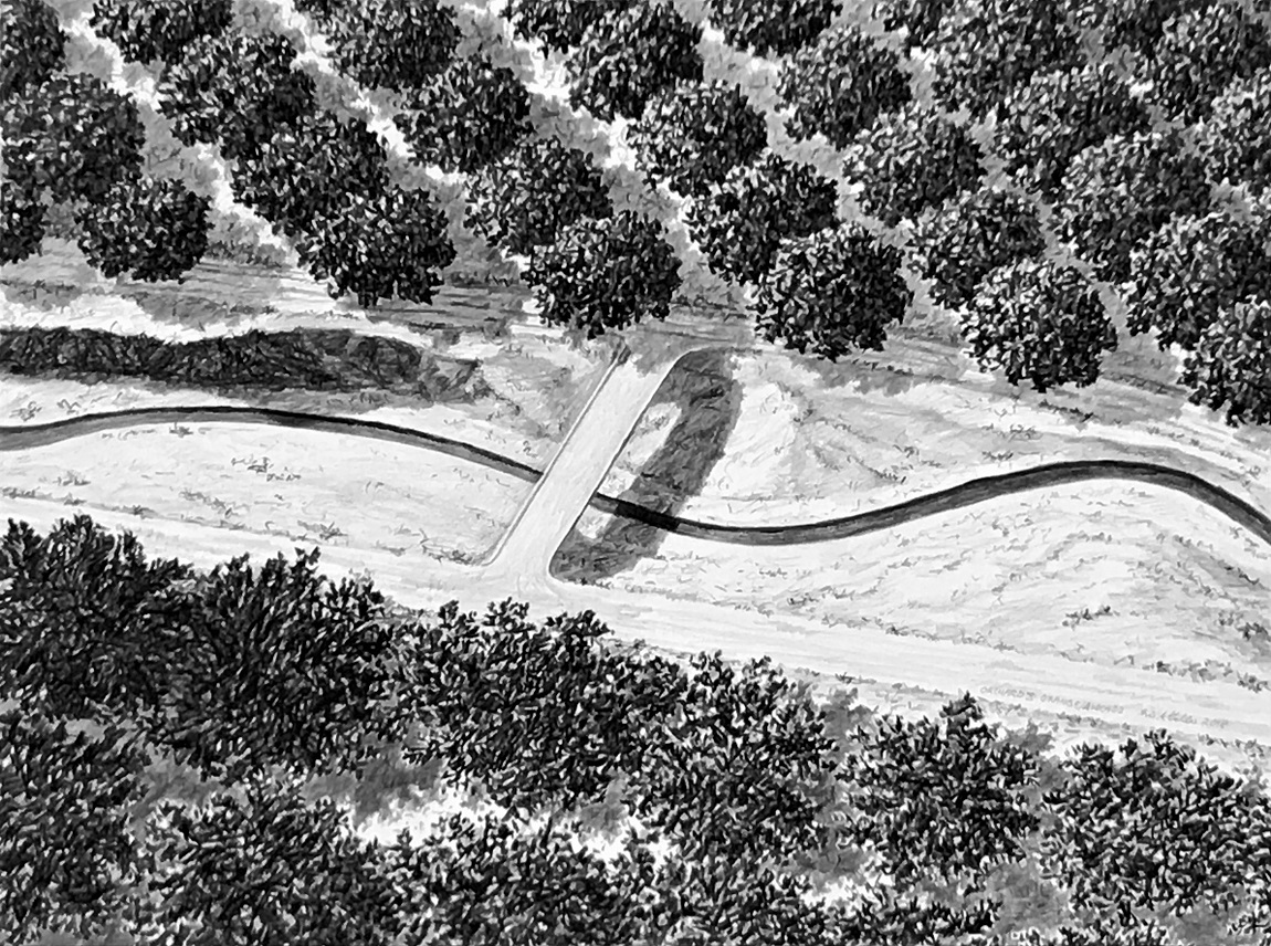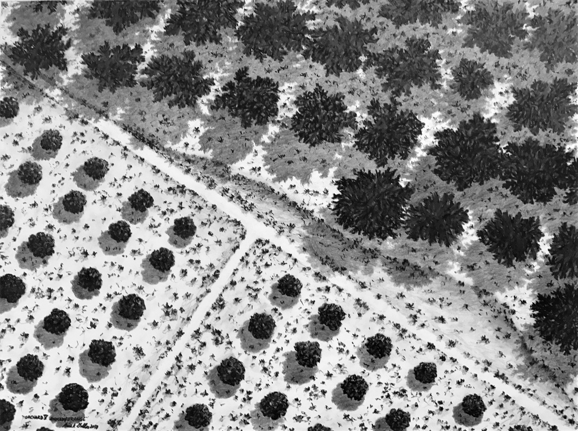 I began this series in 2012. Other commitments intervened, and I returned to this theme in 2017. On flights through California I became fascinated with the striking patterns of light and shadow created by the ubiquitous orchards below. These drawings are a contemplation on the permanence and evanescence of such sights. Healthy, watered and tended orchards in contrast with abandoned and bulldozed orchards giving way to ‘progress,” i.e. malls, industrial parks and housing developments.