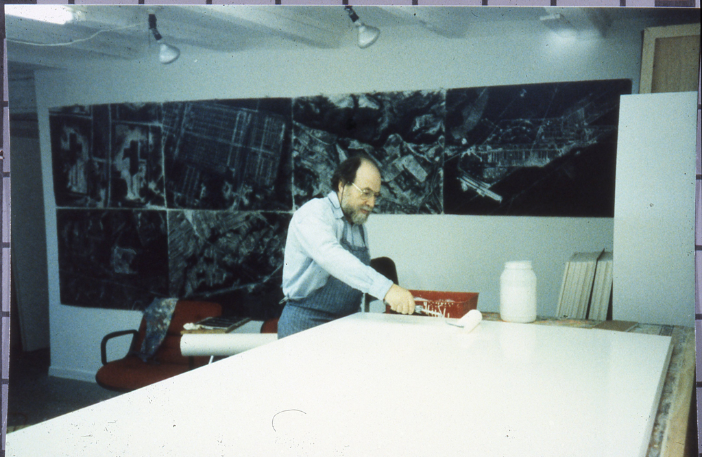#6 “Fourteen Stations/Hey Yud Dalet” Arie A. Galles applying acid-free glue to the Gatorboard. Madison, NJ Spring 1994